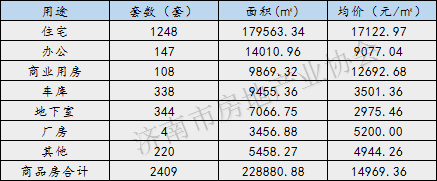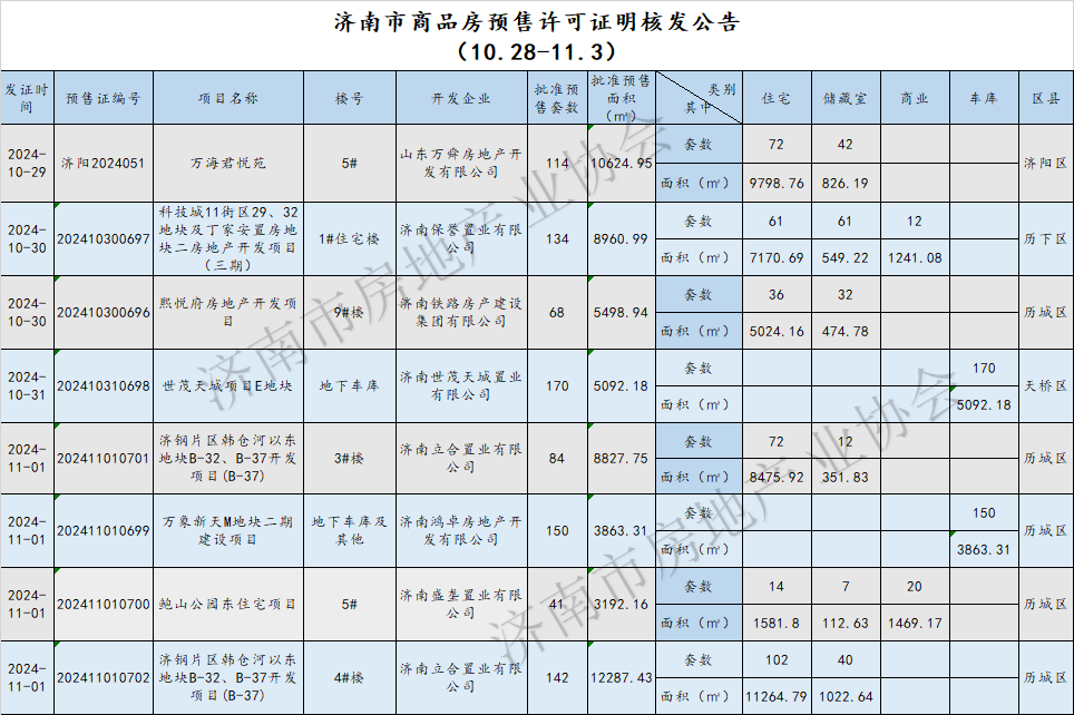 上周(10.28-11.3)共发放了8个预售许可证,批准预售套数903套,批准预售面积约5.8万㎡;新建商品房网签套数2409套,网签面积约22.9万㎡;土地供应19宗,成交19宗。周网签量新建商品房周网签量新建商品住宅周网签量新建商品住宅网签套数排名前五项目:中海天空之镜、华山珑城、悦澜山、保利琅悦、凤凰路壹号院信息来源:济南住宅与房地产信息网预售许可match信息来源:济南市行政审批服务局土地信息土地供应土地成交信息来源:济南公共资源交易中心 来源:济南市房地产业协会