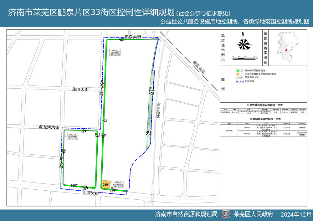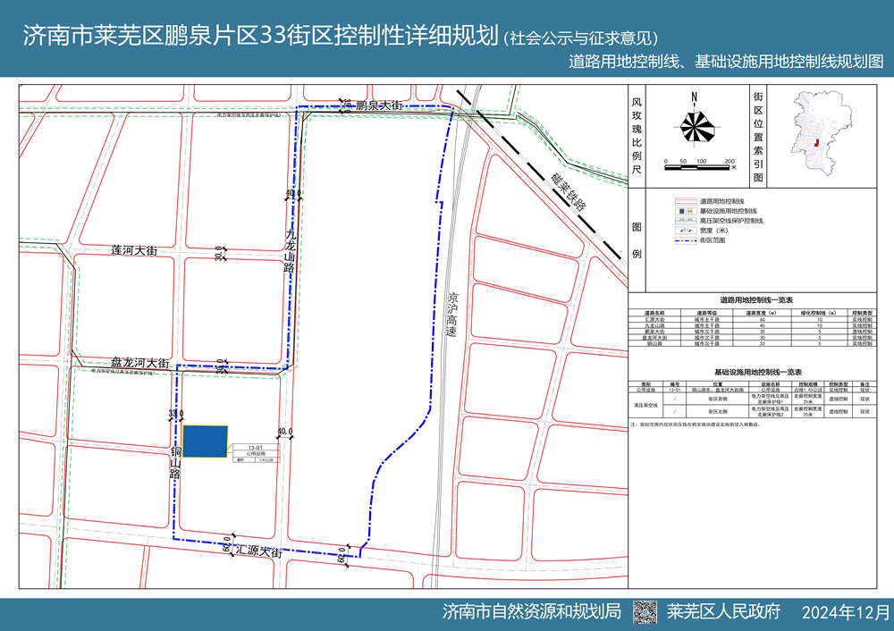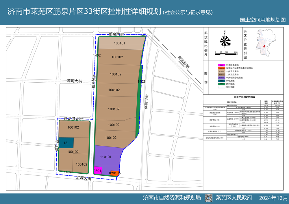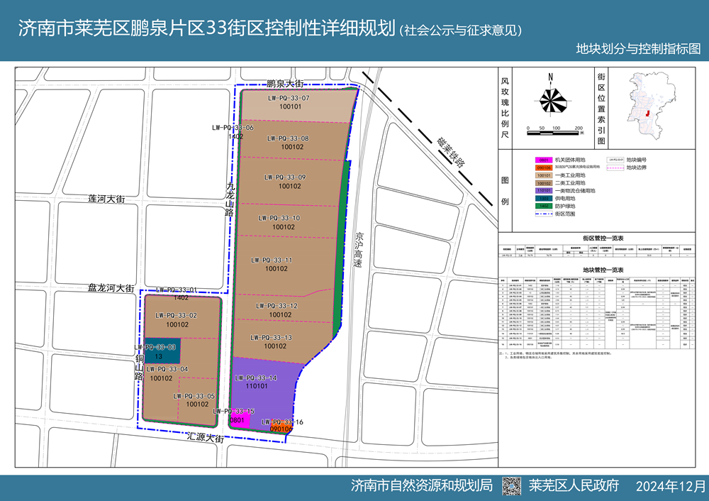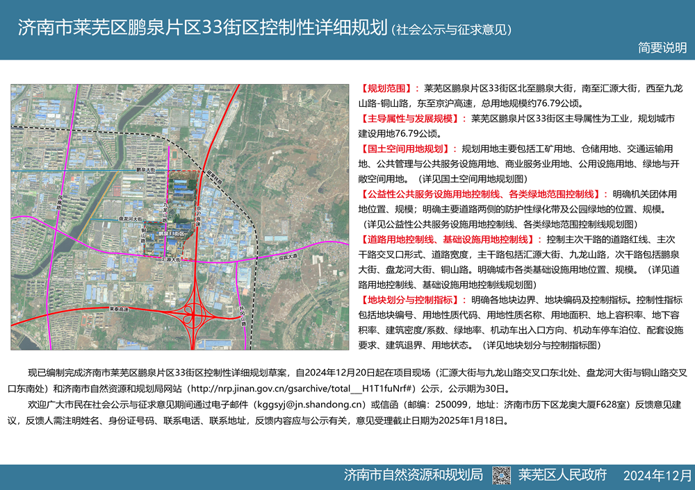 近期,为保障重点项目建设,莱芜区政府组织编制了济南市莱芜区鹏泉片区33街区控制性详细规划方案,从2024年12月20日开始进行社会公示与征求意见。