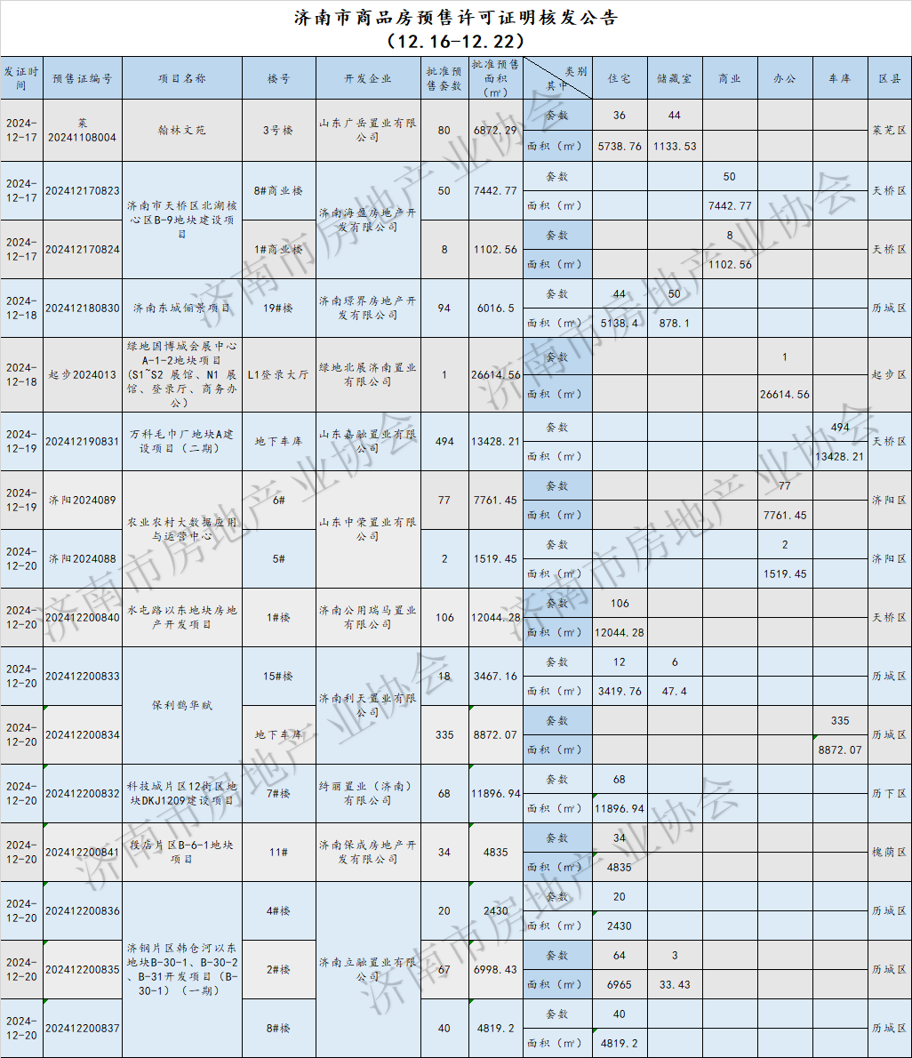 上周(12.16-12.22)共发放了16个预售许可证,批准预售套数 1494套,批准预售面积约12.6万㎡;新建商品房网签套数3161套,网签面积约21.3万㎡;土地供应35宗,成交16宗。周网签量新建商品房周网签量新建商品住宅周网签量新建商品住宅网签套数排名前五项目: 济高揽岳、中建·星光城市、文誉府、中海阅麓山、保利琅悦信息来源:济南住宅与房地产信息网预售许可match信息来源:济南市行政审批服务局土地信息土地供应土地成交信息来源:济南公共资源交易中心 来源:济南市房地产业协会