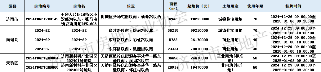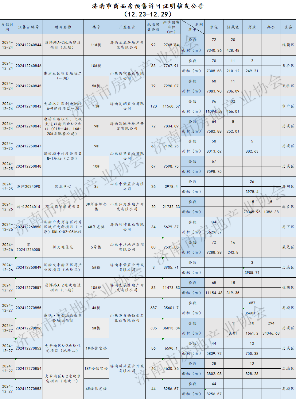 上周(12.23-12.29)共发放了18个预售许可证,批准预售套数 1970套,批准预售面积约21万㎡;新建商品房网签套数2908套,网签面积约24.7万㎡;土地供应6宗,成交19宗。周网签量新建商品房周网签量新建商品住宅周网签量新建商品住宅网签套数排名前五项目: 济高揽岳、保利天禧、御湖境、中建锦绣首府、中海阅麓山信息来源:济南住宅与房地产信息网预售许可match信息来源:济南市行政审批服务局土地信息土地供应土地成交信息来源:济南公共资源交易中心 来源:济南市房地产业协会