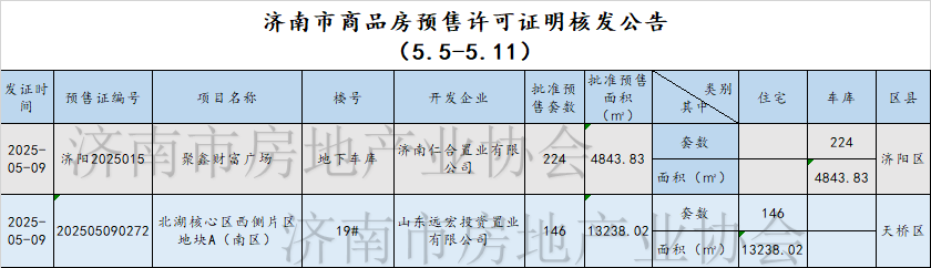 上周(5.5-5.11)共发放了2个预售许可证,批准预售套数370套,批准预售面积约1.8万㎡;新建商品房网签套数1824套,网签面积约15.6万㎡;土地供应1宗,成交6宗。周网签量新建商品房周网签量新建商品住宅周网签量新建商品住宅网签套数排名前五项目:济高揽岳、绿地新里城、中海阅麓山、龙湖景粼原著、雍泉府信息来源:济南住宅与房地产信息网预售许可match信息来源:济南市行政审批服务局土地信息土地供应土地成交信息来源:济南公共资源交易中心 来源:济南市房地产业协会