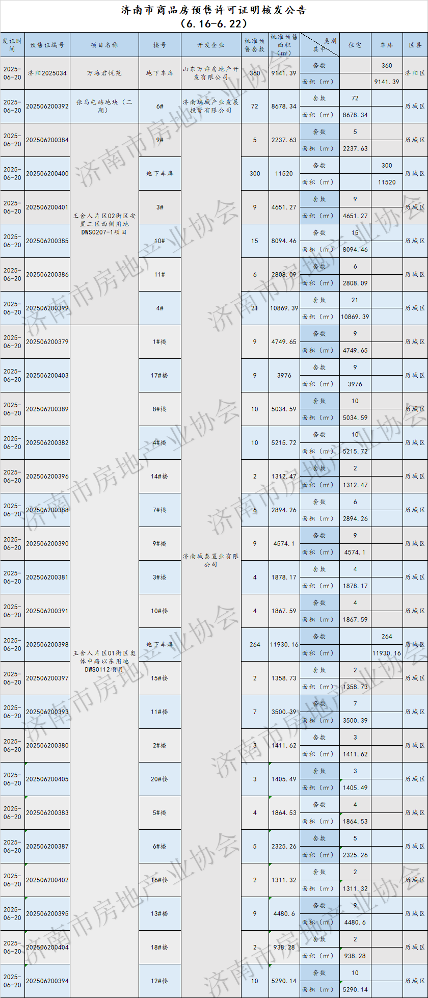 上周(6.16-6.22)共发放了28个预售许可证,批准预售套数1162套,批准预售面积约12.5万㎡;新建商品房网签套数2668套,网签面积约19.47万㎡;土地供应15宗,成交0宗。周网签量新建商品房周网签量新建商品住宅周网签量新建商品住宅网签套数排名前五项目:龙湖御湖镜、海棠悦府;中海岳麓山;中海天空之境;保利珑誉、济高揽岳;龙湖景粼原著。信息来源:济南住宅与房地产信息网预售许可match信息来源:济南市行政审批服务局土地信息土地供应土地成交上周暂无新增土地成交信息来源:济南公共资源交易中心 来源:济南市房地产业协会