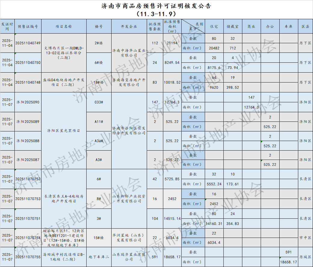 上周(11.3-11.9)共发放了12个预售许可证,批准预售套数1147套,批准预售面积约10万㎡;新建商品房网签套数1487套,网签面积约11.2万㎡;土地供应12宗,成交2宗。周网签量新建商品房周网签量新建商品住宅周网签量新建商品住宅网签套数排名前五项目:中海未来之境、中和东方云境、理想之城、海尔·云世界天玺、中粮祥云小区信息来源:济南住宅与房地产信息网预售许可match信息来源:济南市行政审批服务局土地信息土地供应土地成交信息来源:济南公共资源交易中心 来源:济南市房地产业协会