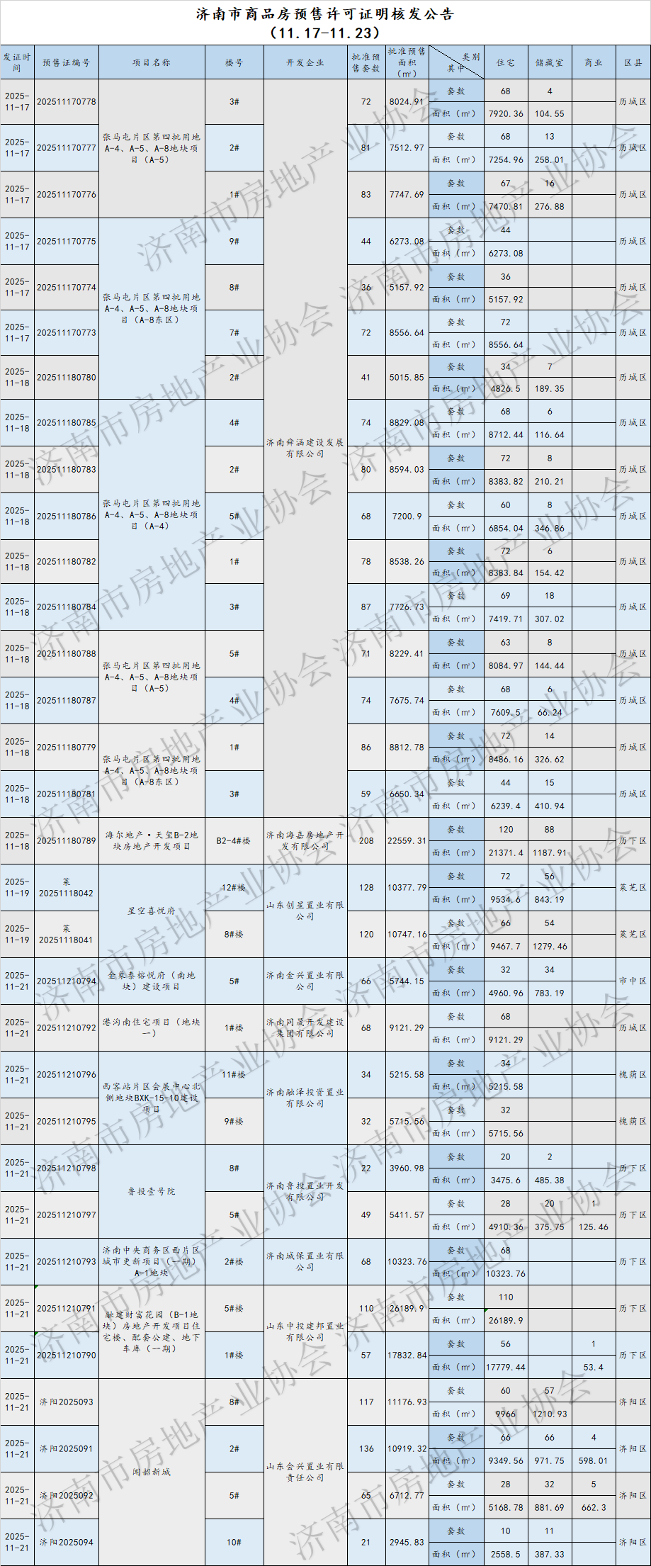 上周(11.17-11.23)共发放了32个预售许可证,批准预售套数2407套,批准预售面积约28.5万㎡;新建商品房网签套数1683套,网签面积约12.8万㎡;土地供应5宗,成交8宗。周网签量新建商品房周网签量新建商品住宅周网签量新建商品住宅网签套数排名前五项目:能源·保利明湖印、熙悦府、中海未来之境、海信观悦苑、中海天空之镜信息来源:济南住宅与房地产信息网预售许可match信息来源:济南市行政审批服务局土地信息土地供应土地成交信息来源:济南公共资源交易中心 来源:济南市房地产业协会